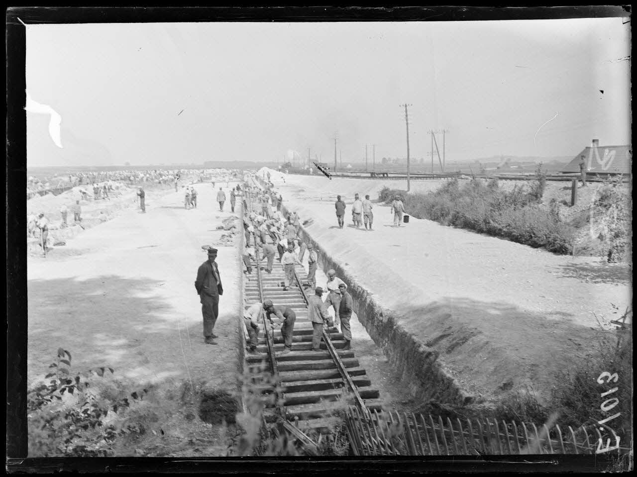 Sur la route de St Quentin-Amiens, au lieu-dit "Le Petit Blangy Cabaret". Commune de Blangy-Tronville (Somme). Construction d'un quai de débarquement, pose de la voie ferrée. [légende d'origine]