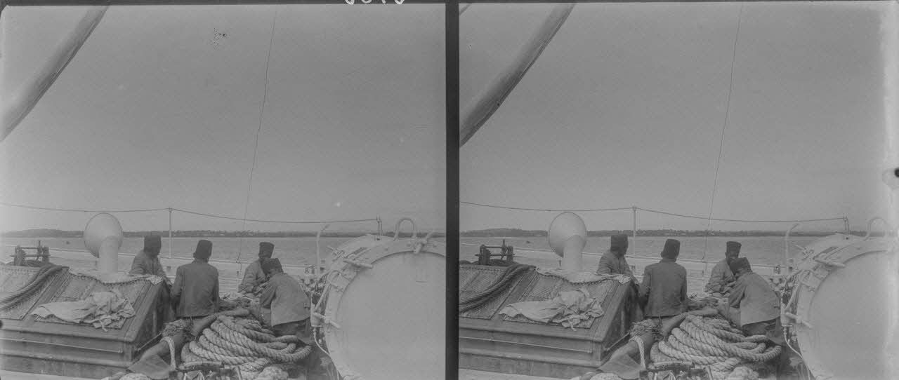 Sur le gaillard d'avant. Un tirailleur qui, par jalousie avait tué d'un coup de couteau [illisible] un de ses camarades [...] est conduit sous escorte à Diego, pour y passer au conseil de guerre. [légende d'origine]