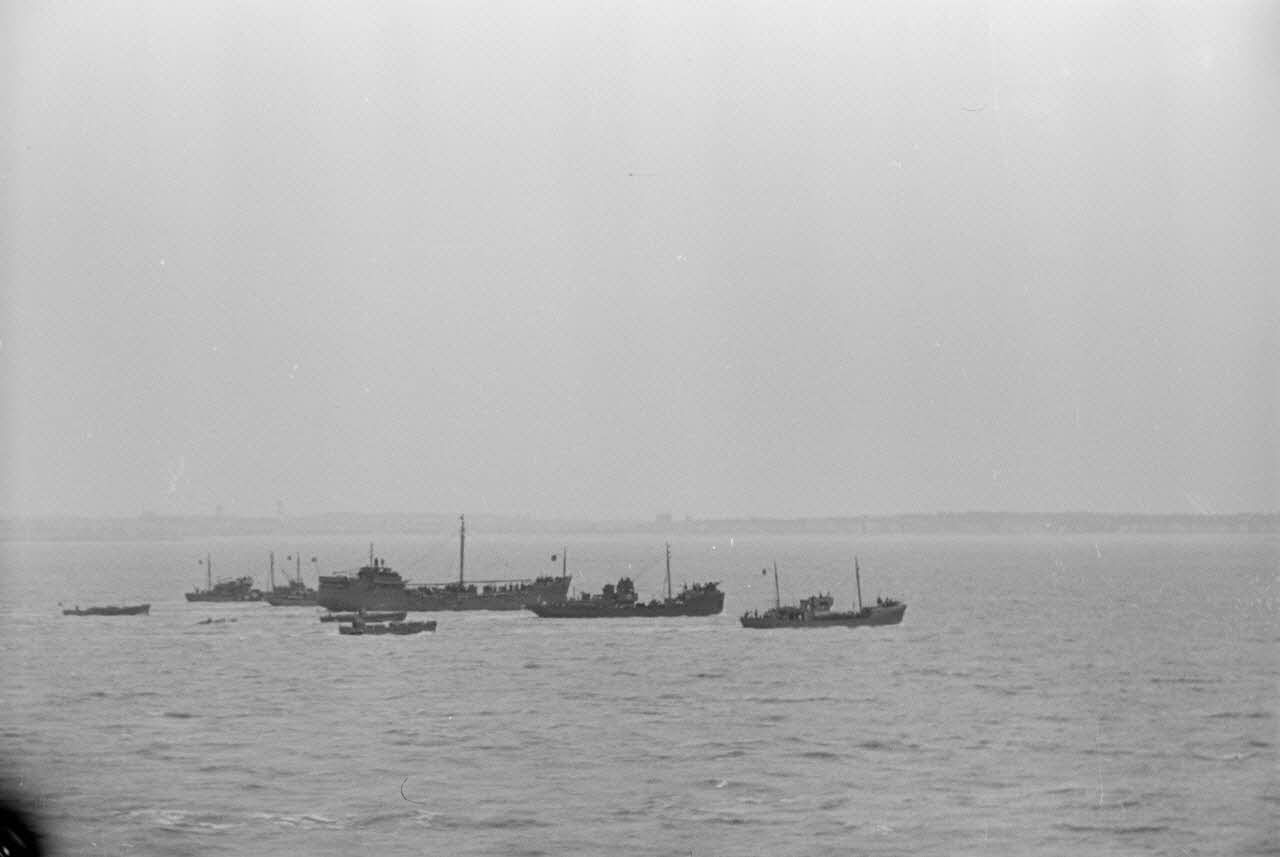 Sur le pont d'un navire, dans le cadre de l'opération Seelöwe, une flotte de navires allemands progresse pour un entrainement.