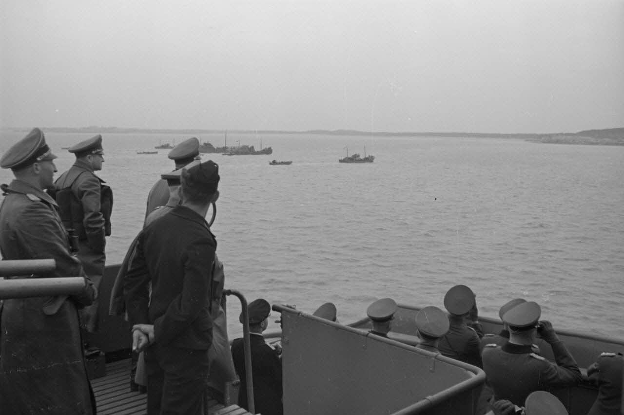Sur le pont d'un navire, dans le cadre de l'opération Seelöwe, une flotte de navires allemands progresse pour un entrainement.