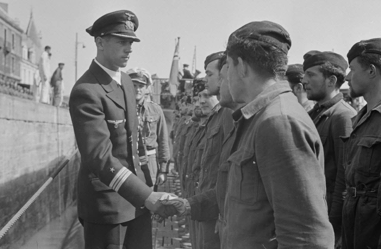 A l'issue de sa 5e mission en mer à bord du sous-marin U-552, le lieutenant (Oberleutnant zur See) Erich Topp passe en revue des autorités de la Kriegsmarine rassemblées sur le quai du port de Saint-Nazaire.