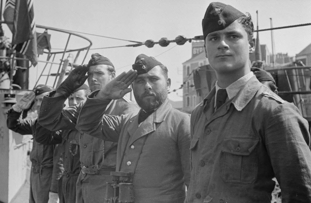 A l'issue de sa 5e mission en mer à bord du sous-marin U-552, le lieutenant (Oberleutnant zur See) Erich Topp salue des autorités de la Kriegsmarine rassemblées sur le quai du port de Saint-Nazaire.
