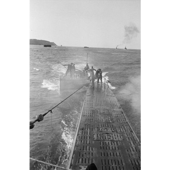 Peu avant le retour de croisière au port de Brest, un bateau se rapproche du U-boot U-203 pour y faire monter des marins.