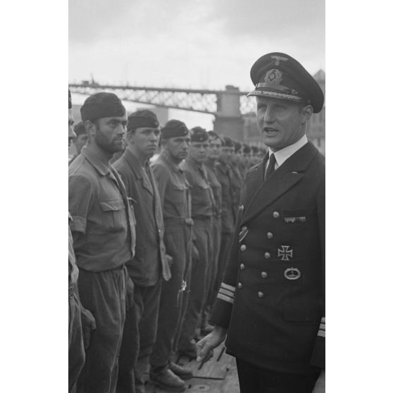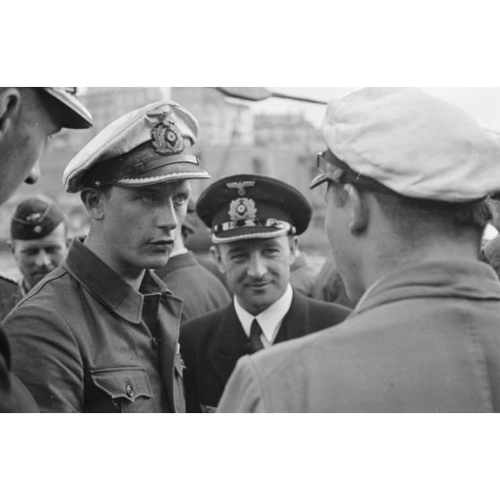Le capitaine de corvette Hans Cohausz, représentant de la 1.Unterseebootsflottille, accueille à Brest l'équipage du sous-marin U-203 et son commandant, le Kapitänleutnant Rolf Mützelburg.