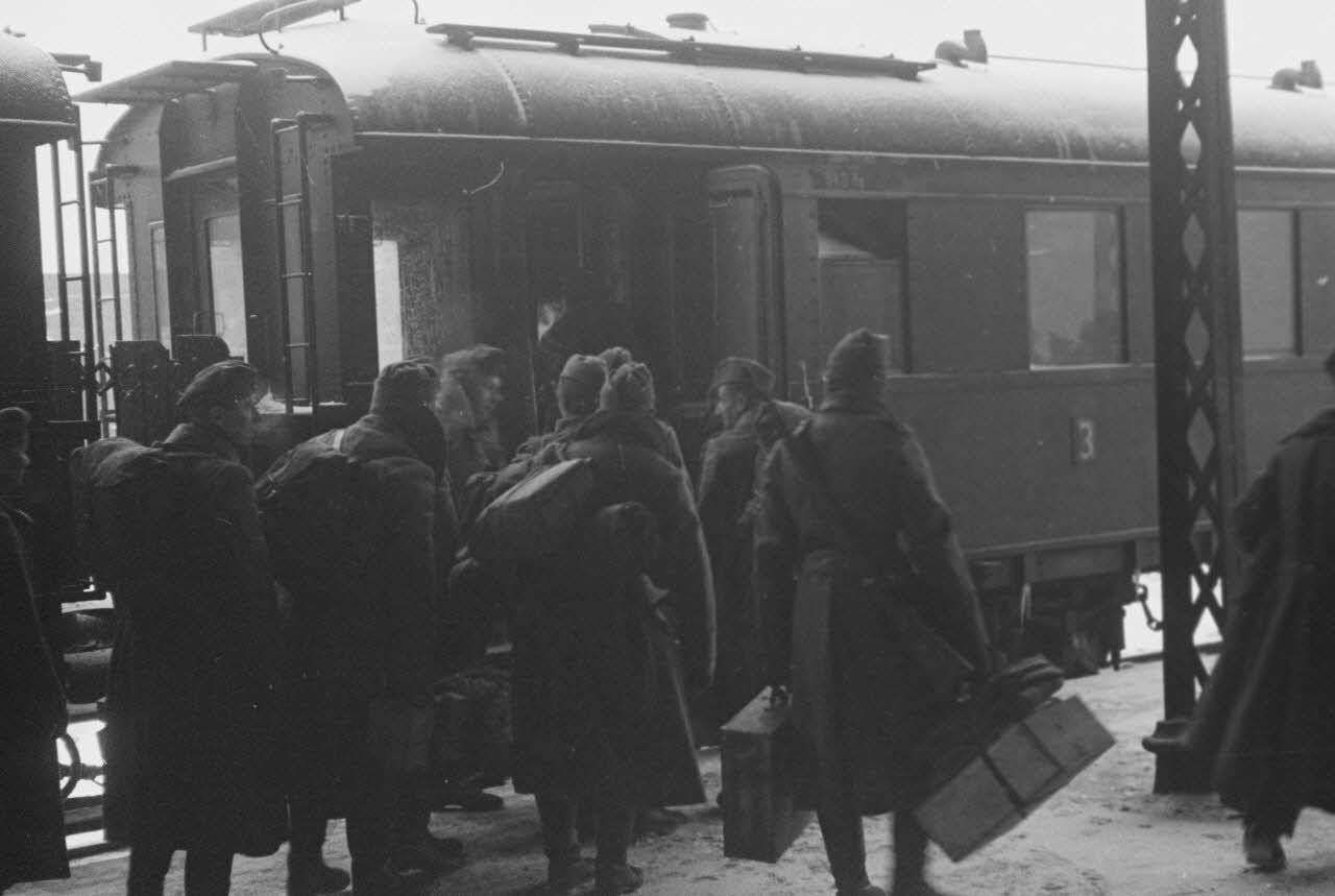 Sur le quai d'une gare, des permissionnaires allemands rejoignent leur affectation.