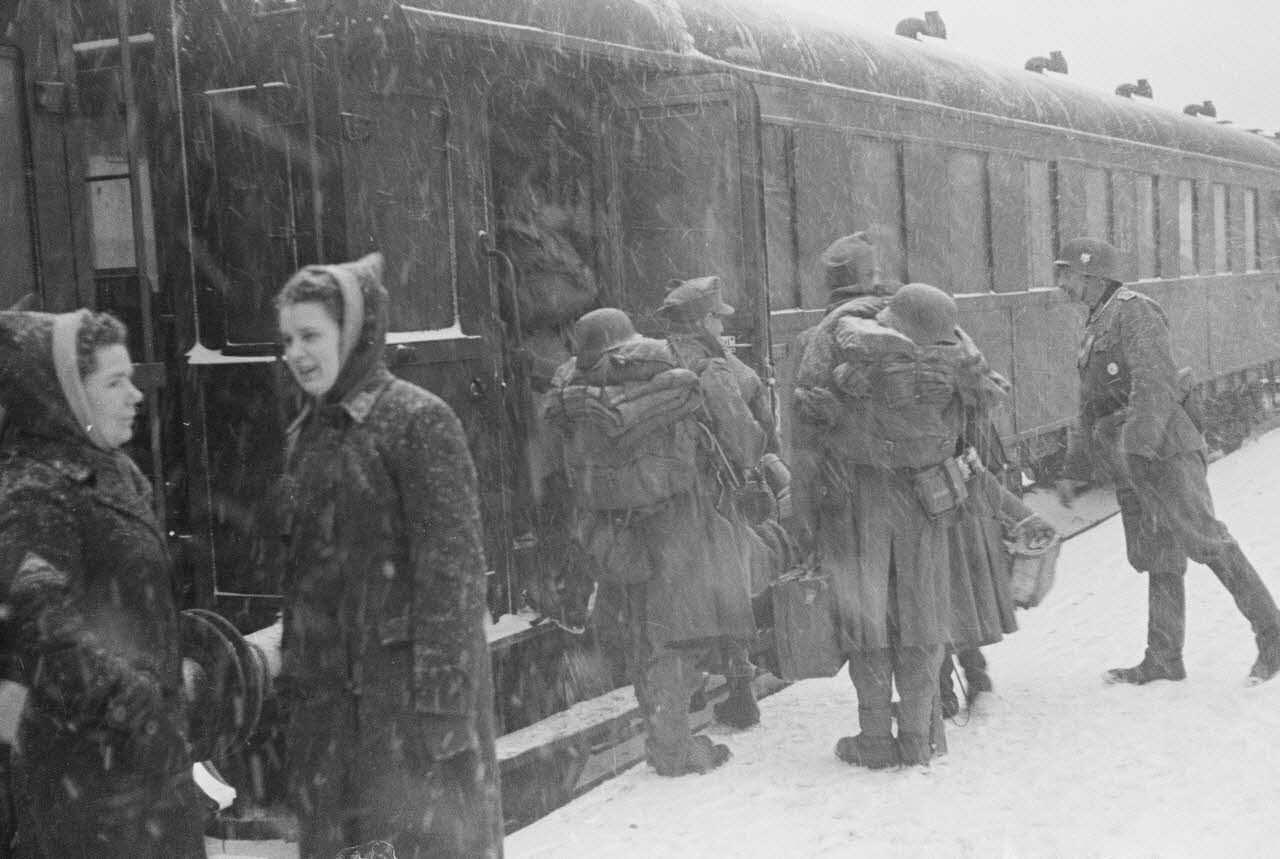 Sur le quai d'une gare, des permissionnaires allemands rejoignent leur affectation.