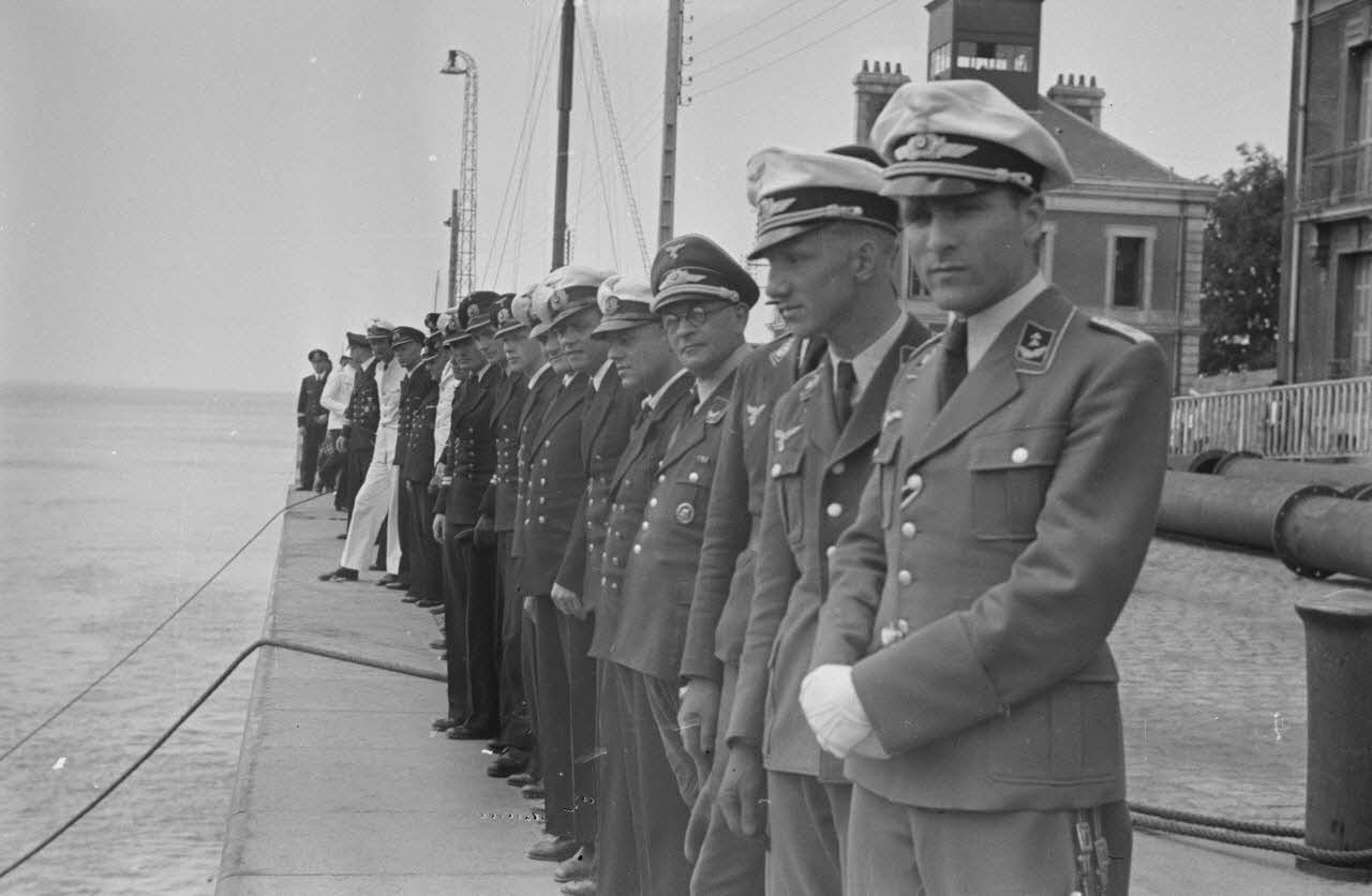 Sur le quai du port de Saint-Nazaire, des officiers de la Luftwaffe et de la Kriegsmarine lors de l'arrivée du sous-marin U-203.