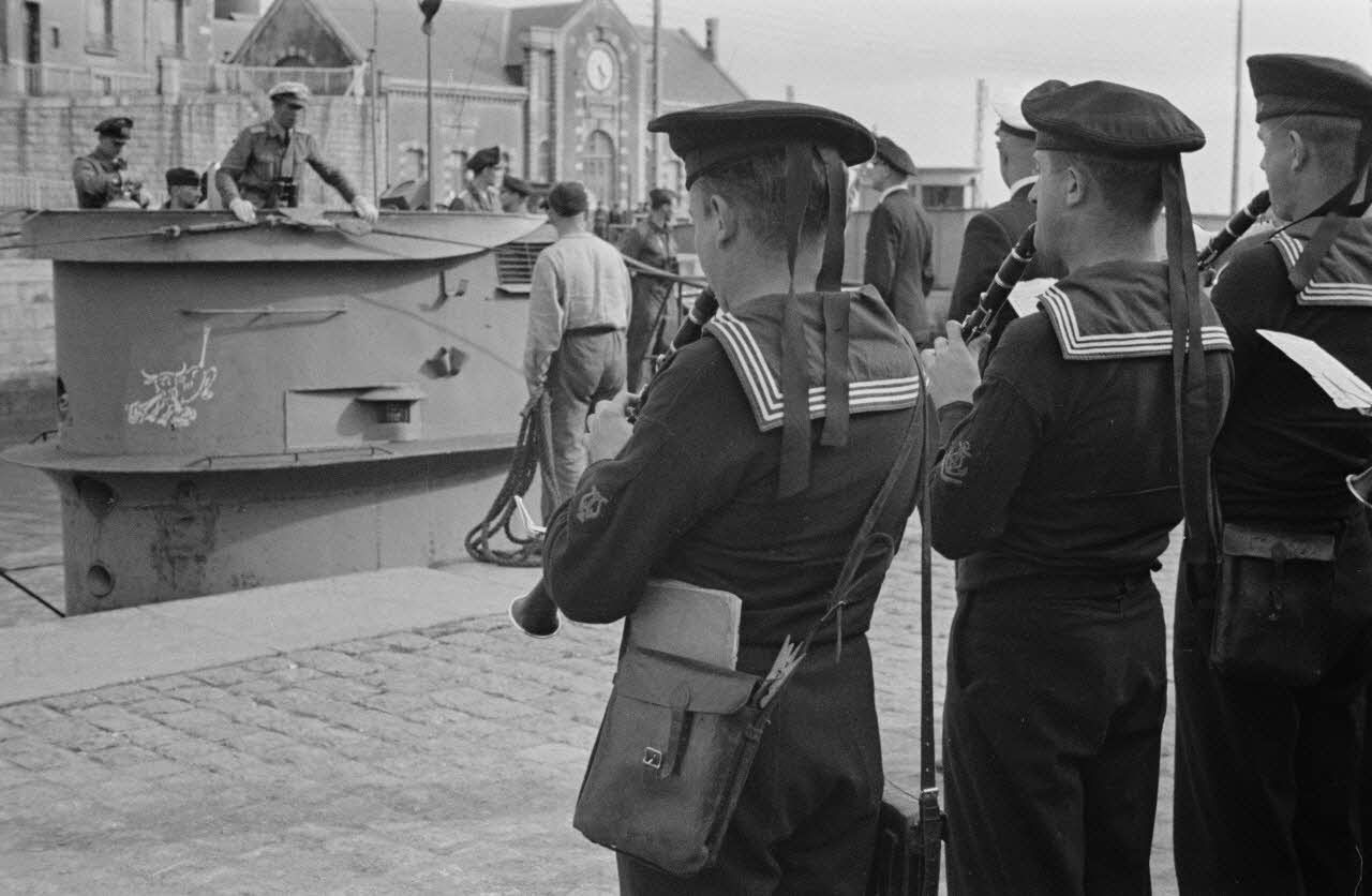 Sur le quai du port de Saint-Nazaire, la musique de la marine allemande accueille le sous-marin de retour de mission en mer.