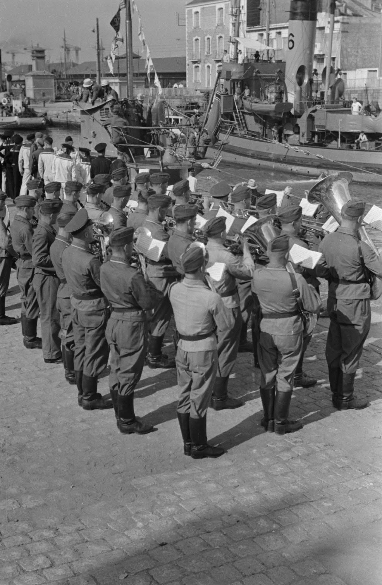 Sur le quai du port de Saint-Nazaire, la musique militaire rythme le retour du sous-marin U-69 dans le port.