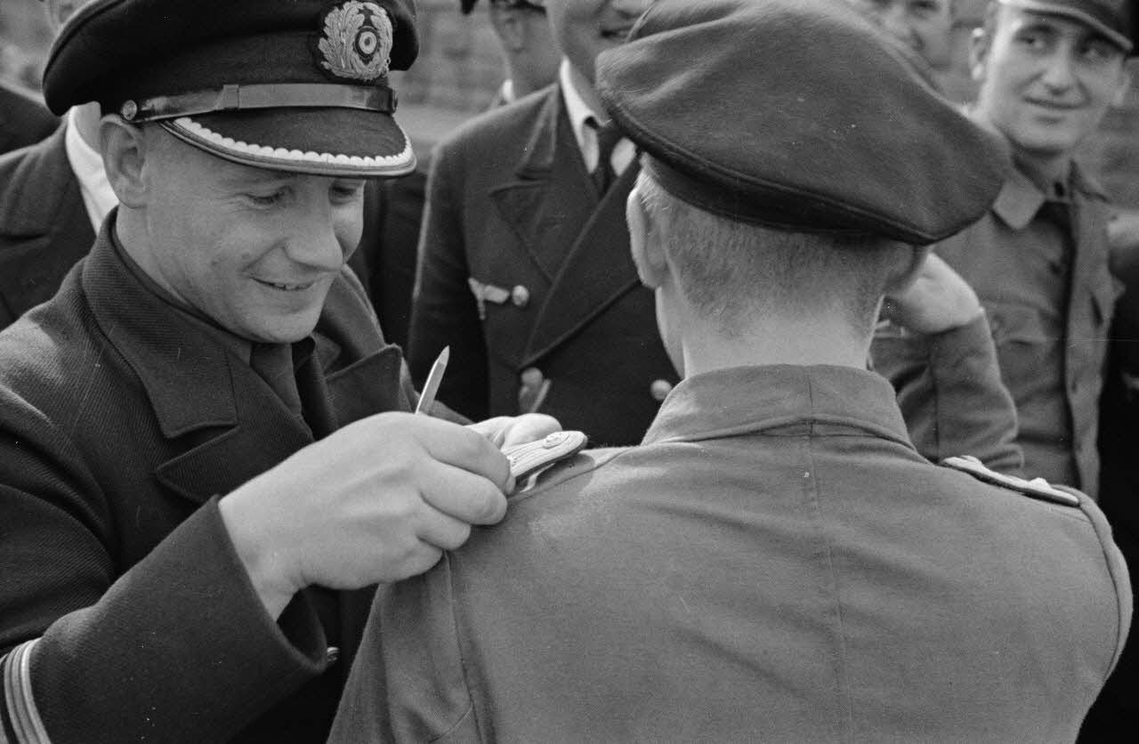 Un Kapitänleutnant, commandant du sous-marin de retour de croisière, est accueilli par ses homologues de la marine allemande.