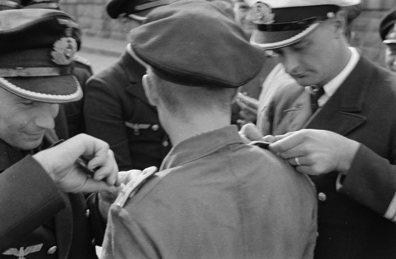Un Kapitänleutnant, commandant du sous-marin de retour de croisière, est accueilli par ses homologues de la marine allemande.