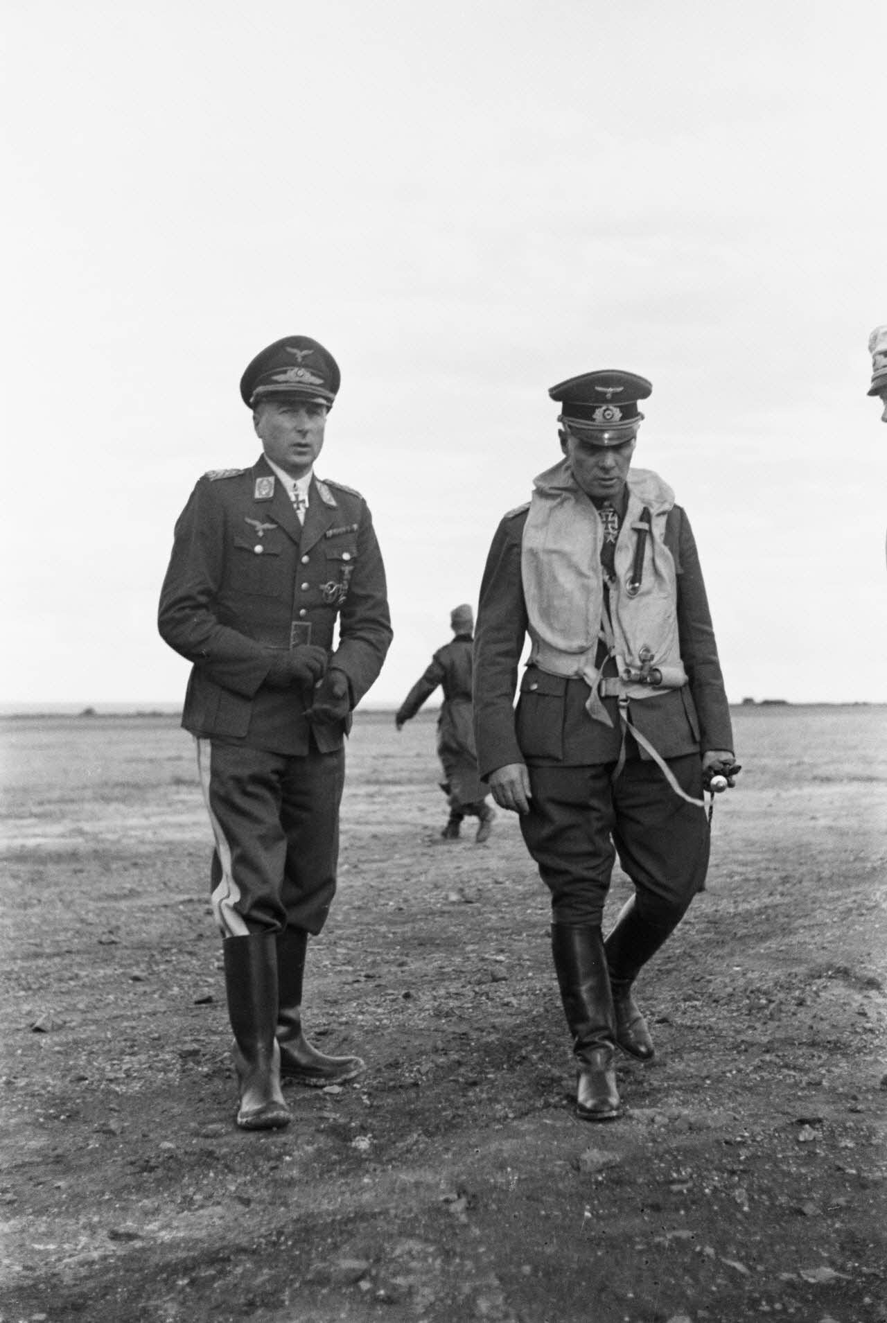 Sur le terrain d'aviation d'Héraklion (Crète), le maréchal Erwin Rommel en compagnie du général (Generalleutnant) von Waldau.