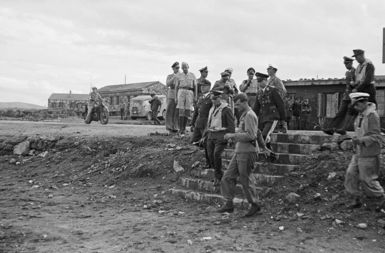 Sur le terrain d'aviation d'Héraklion (Crète), la rencontre entre le maréchal Erwin Rommel, le général (Generalleutnant) Otto Hoffmann von Waldau et le général Friedrich-Wilhelm Müller.