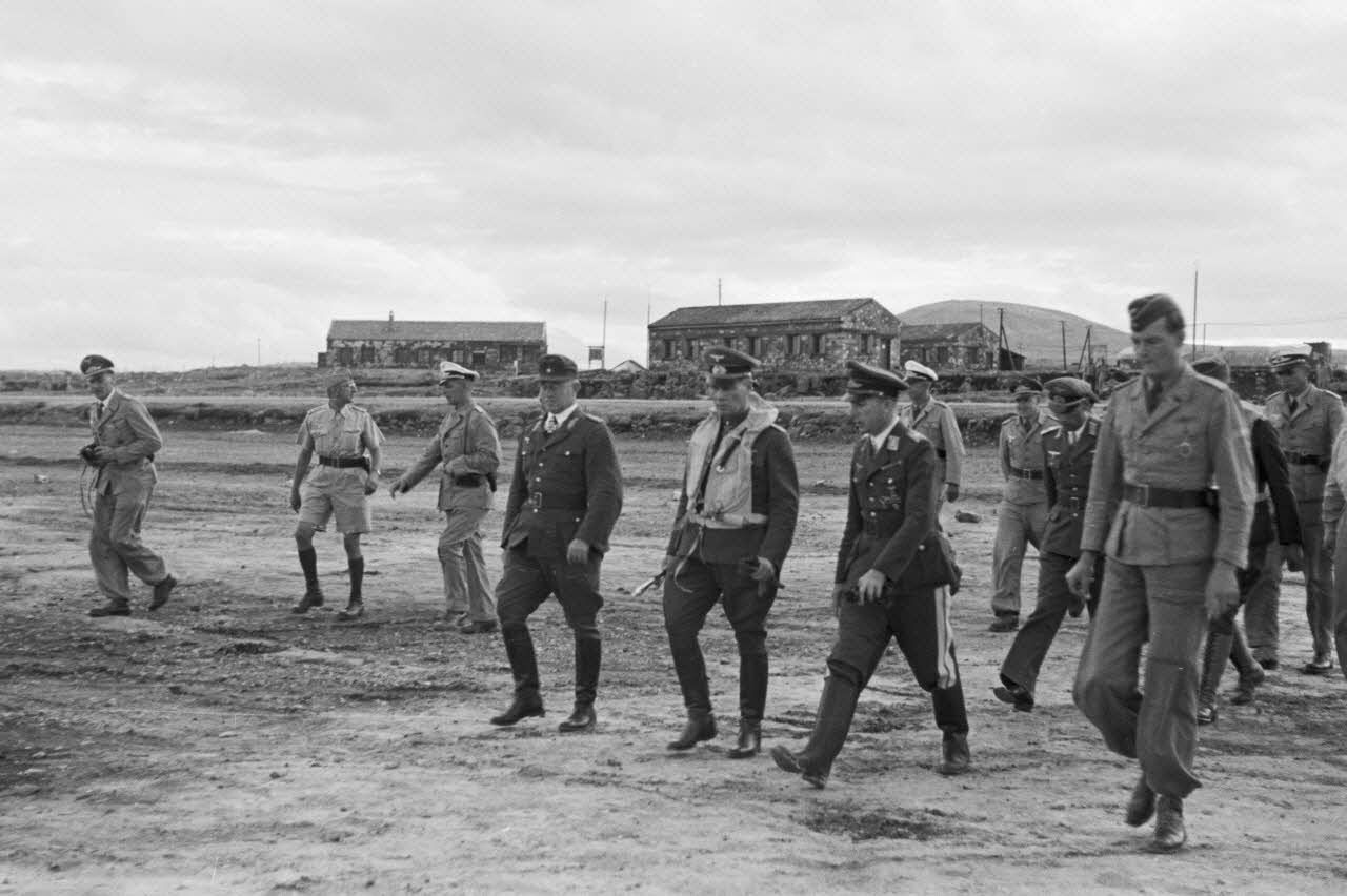 Sur le terrain d'aviation d'Héraklion (Crète), la rencontre entre le maréchal Erwin Rommel, le général (Generalleutnant) Otto Hoffmann von Waldau et le général Friedrich-Wilhelm Müller.