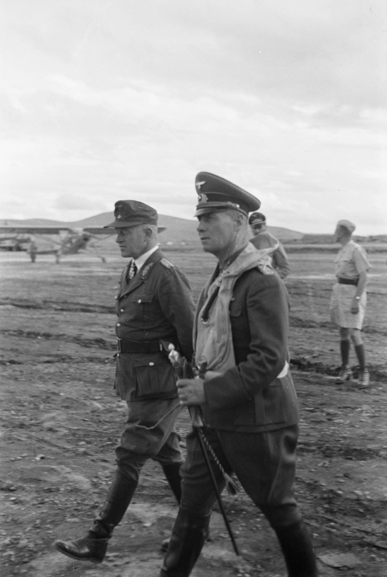 Sur le terrain d'aviation d'Héraklion (Crète), le maréchal Erwin Rommel en compagnie du général (Generalmajor) Müller.