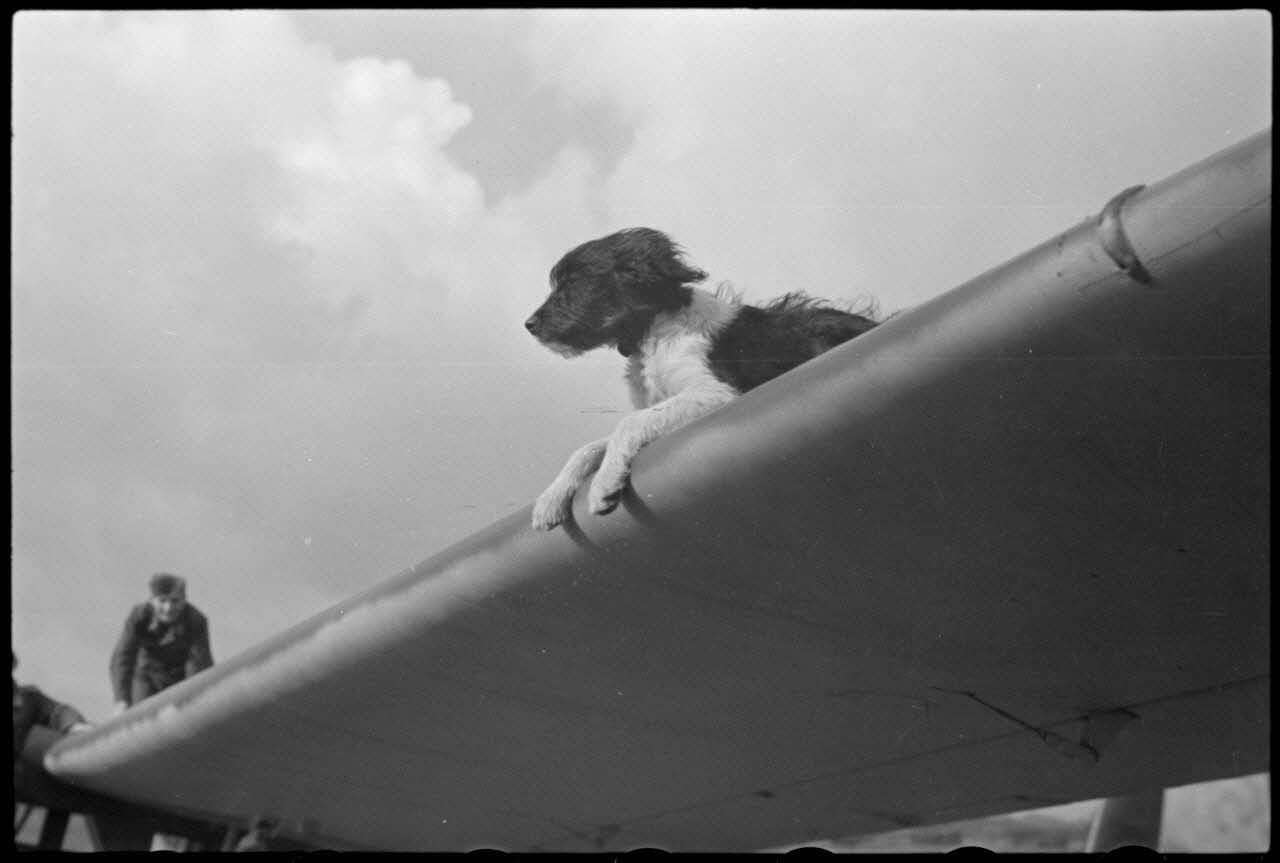 Sur le terrain d'aviation de Banak, la mascotte et des pilotes de planeur DFS-230 du Luftlandegeschwader 1 (8./LLG 1).