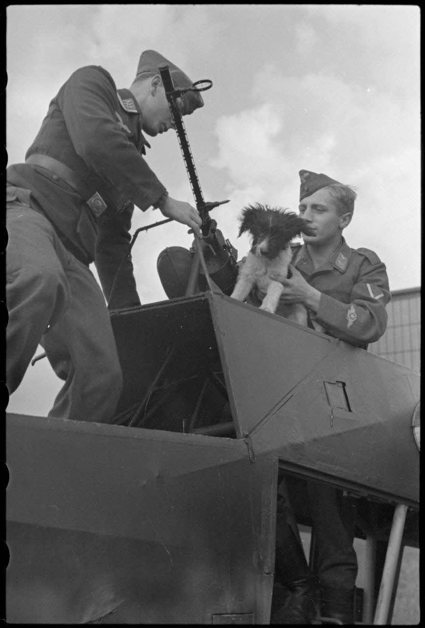 Sur le terrain d'aviation de Banak, la mascotte et des pilotes de planeur DFS-230 du Luftlandegeschwader 1 (8./LLG 1).