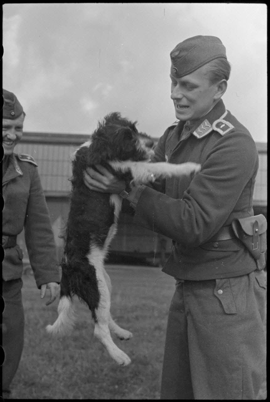 Sur le terrain d'aviation de Banak en Norvège, la mascotte et des pilotes de planeur DFS-230 du Luftlandegeschwader 1 (8./LLG 1).