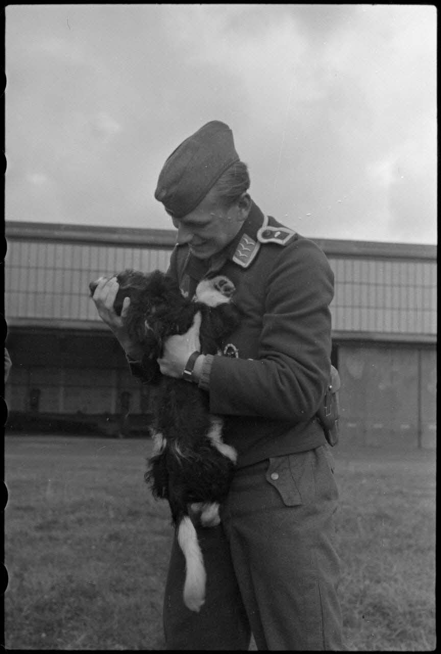Sur le terrain d'aviation de Banak en Norvège, la mascotte et des pilotes de planeur DFS-230 du Luftlandegeschwader 1 (8./LLG 1).