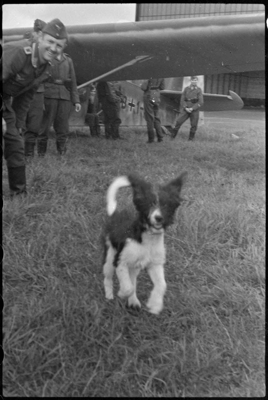 En Norvège, sur le terrain d'aviation de Banak, la mascotte et un équipage de planeur DFS-230 du Luftlandegeschwader 1 (8./LLG 1).
