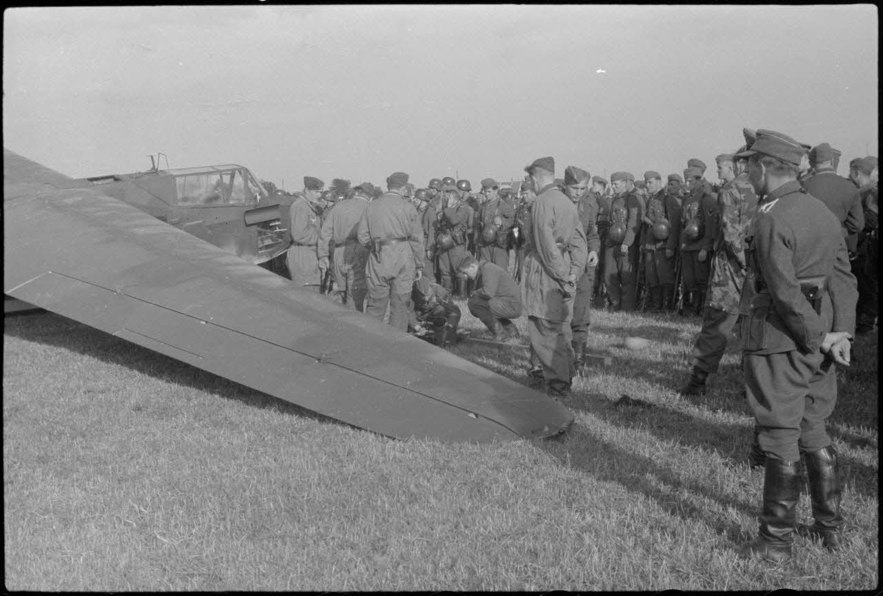 Un groupe important de fantassins observent un planeur DFS-230 (immatriculé LB+1-93) posé dans un champ. Le personnel au sol du Luftlandegechwader 1 conditionne ensuite le planeur pour le voyage de retour vers le terrain.