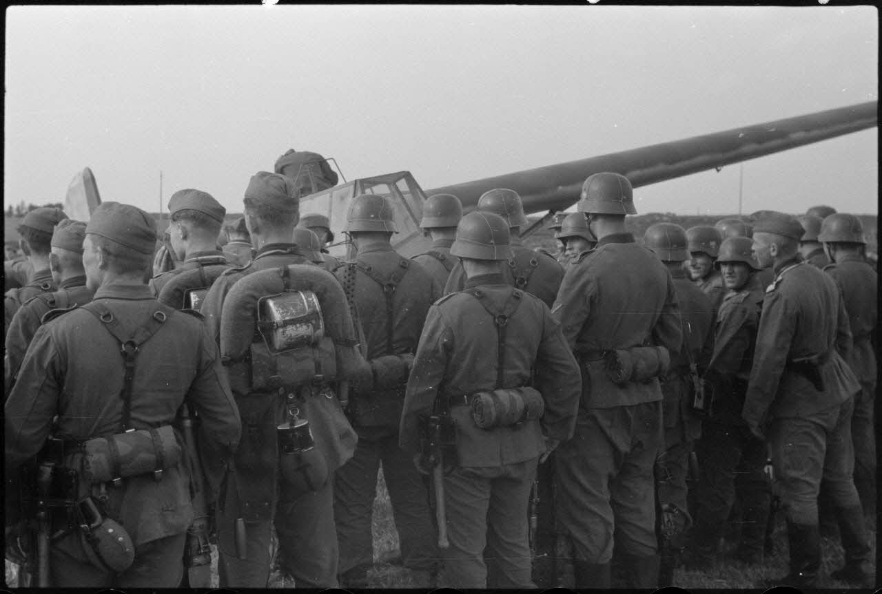 Un groupe important de fantassins observent un planeur DFS-230 (immatriculé LB+1-93) posé dans un champ. Le personnel au sol du Luftlandegechwader 1 conditionne ensuite le planeur pour le voyage de retour vers le terrain.