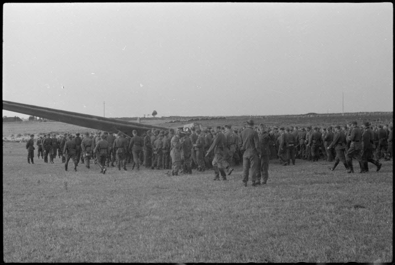 Un groupe important de fantassins observent un planeur DFS-230 (immatriculé LB+1-93) posé dans un champ. Le personnel au sol du Luftlandegechwader 1 conditionne ensuite le planeur pour le voyage de retour vers le terrain.