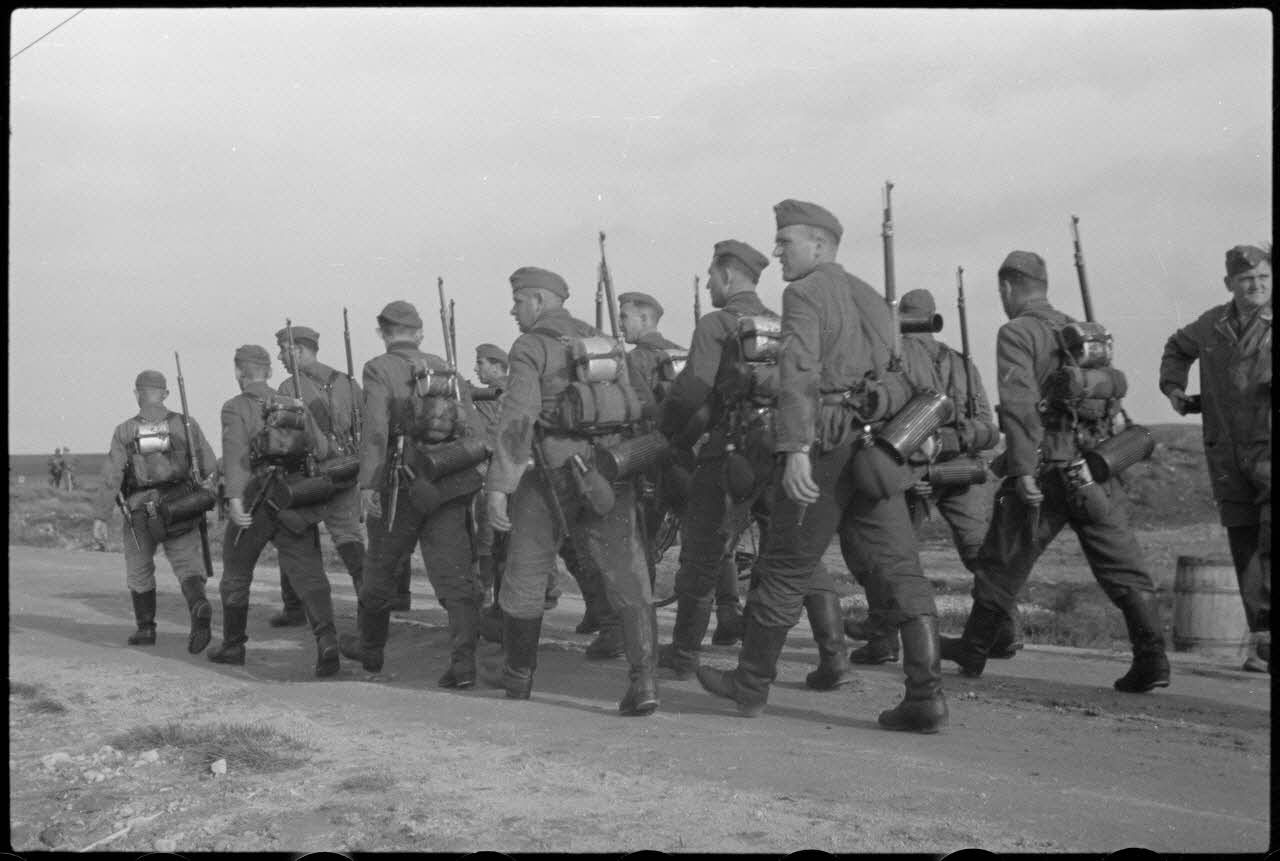 Sur le terrain d'aviation de Banak (Norvège) à l'issue de manoeuvres communes entre l'armée de terre allemande et le 8./LLG 1, les troupes regagnent leur casernement.