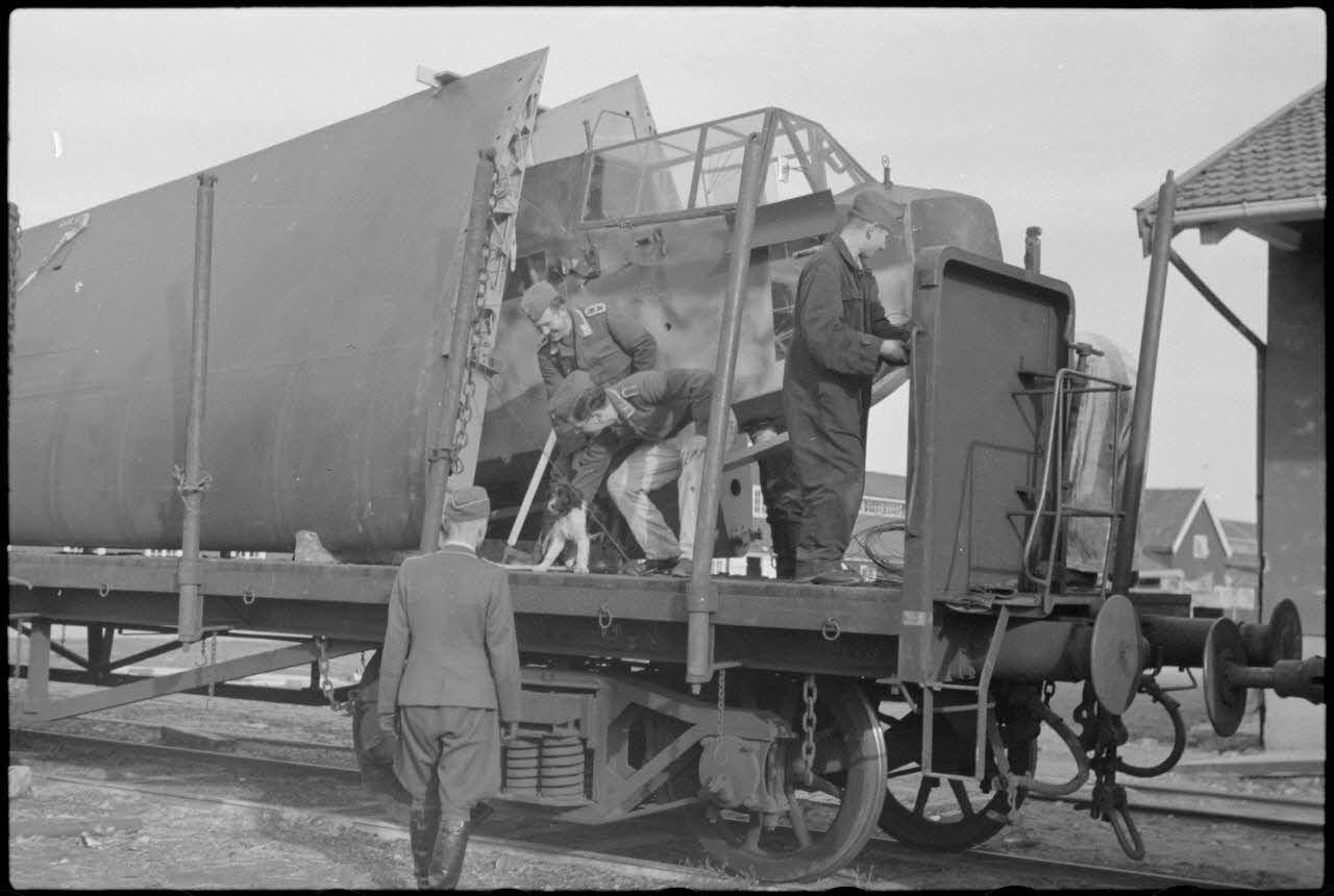Sur le terrain d'aviation de Gardermoen, la mascotte du 8./LLG 1 (Lulftlandegeschwader 1) vient perturber le personnel du groupe lors de la fixation des planeurs DFS-230 sur des wagons de chemin de fer.