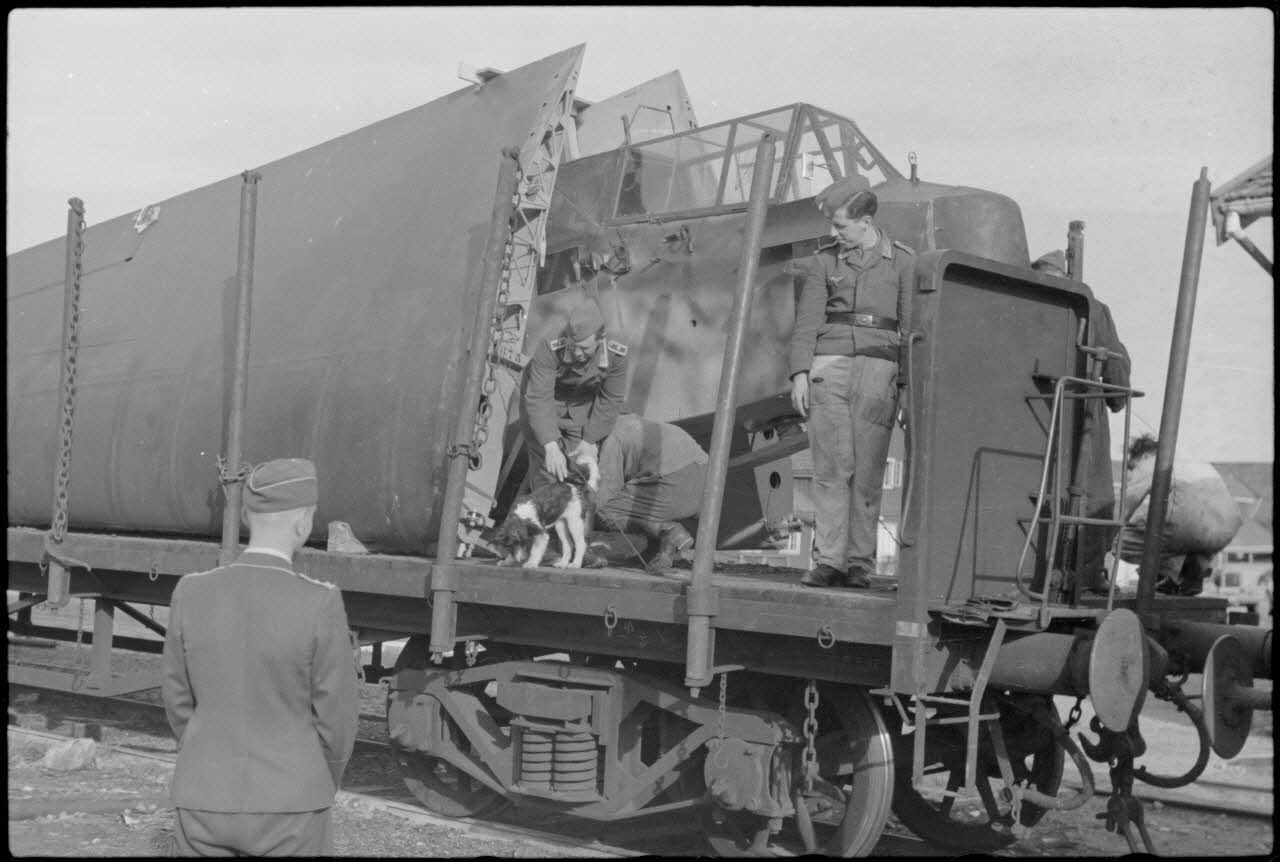 Sur le terrain d'aviation de Gardermoen, la mascotte du 8./LLG 1 (Lulftlandegeschwader 1) vient perturber le personnel du groupe lors de la fixation des planeurs DFS-230 sur des wagons de chemin de fer.
