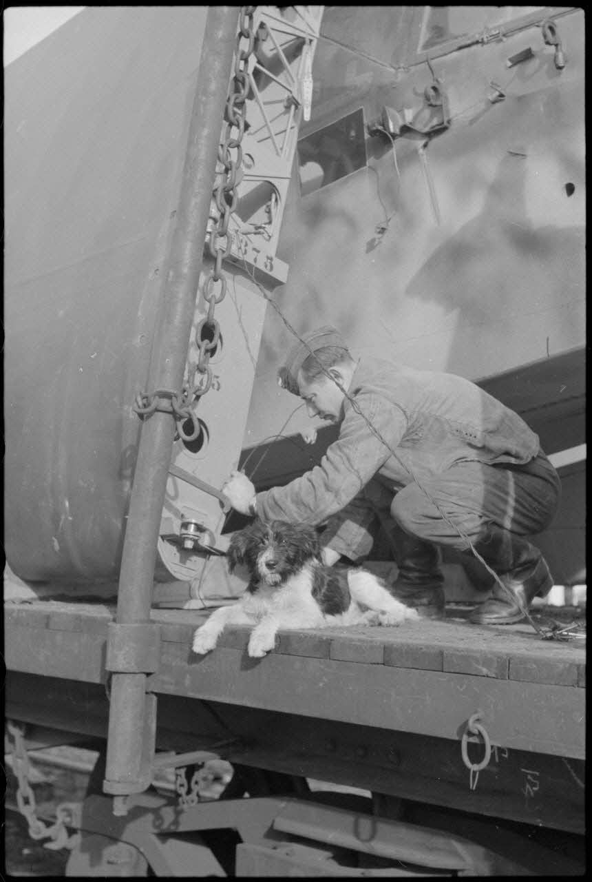 Sur le terrain d'aviation de Gardermoen, la mascotte du 8./LLG 1 (Lulftlandegeschwader 1) vient perturber le personnel du groupe lors de la fixation des planeurs DFS-230 sur des wagons de chemin de fer.