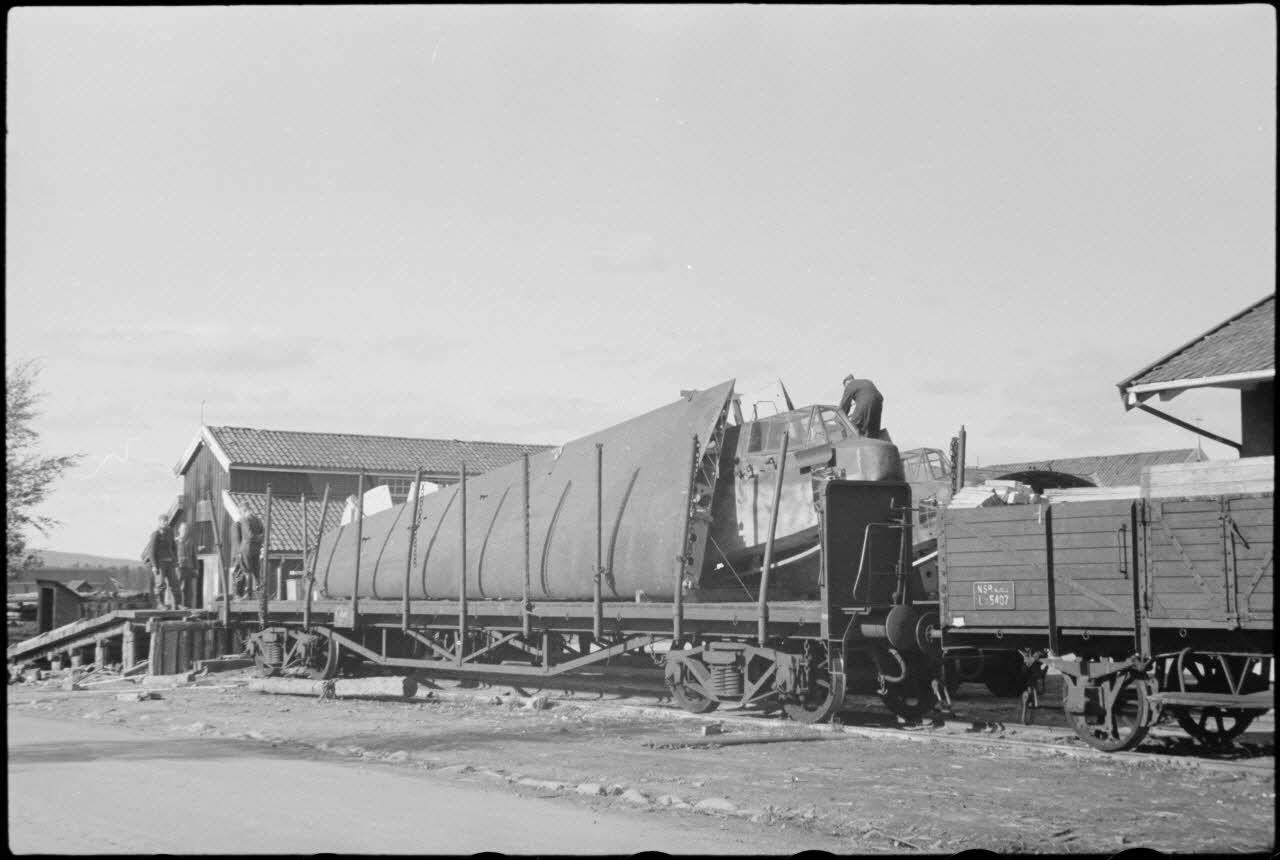 Sur le terrain d'aviation de Gardermoen, le personnel du 8./LLG 1 (Lulftlandegeschwader 1) charge des pièces de planeurs DFS-230 sur des wagons de chemin de fer.