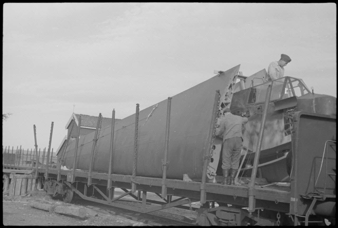 Sur le terrain d'aviation de Gardermoen, le personnel du 8./LLG 1 (Lulftlandegeschwader 1) fixe les planeurs DFS-230 sur des wagons de chemin de fer.