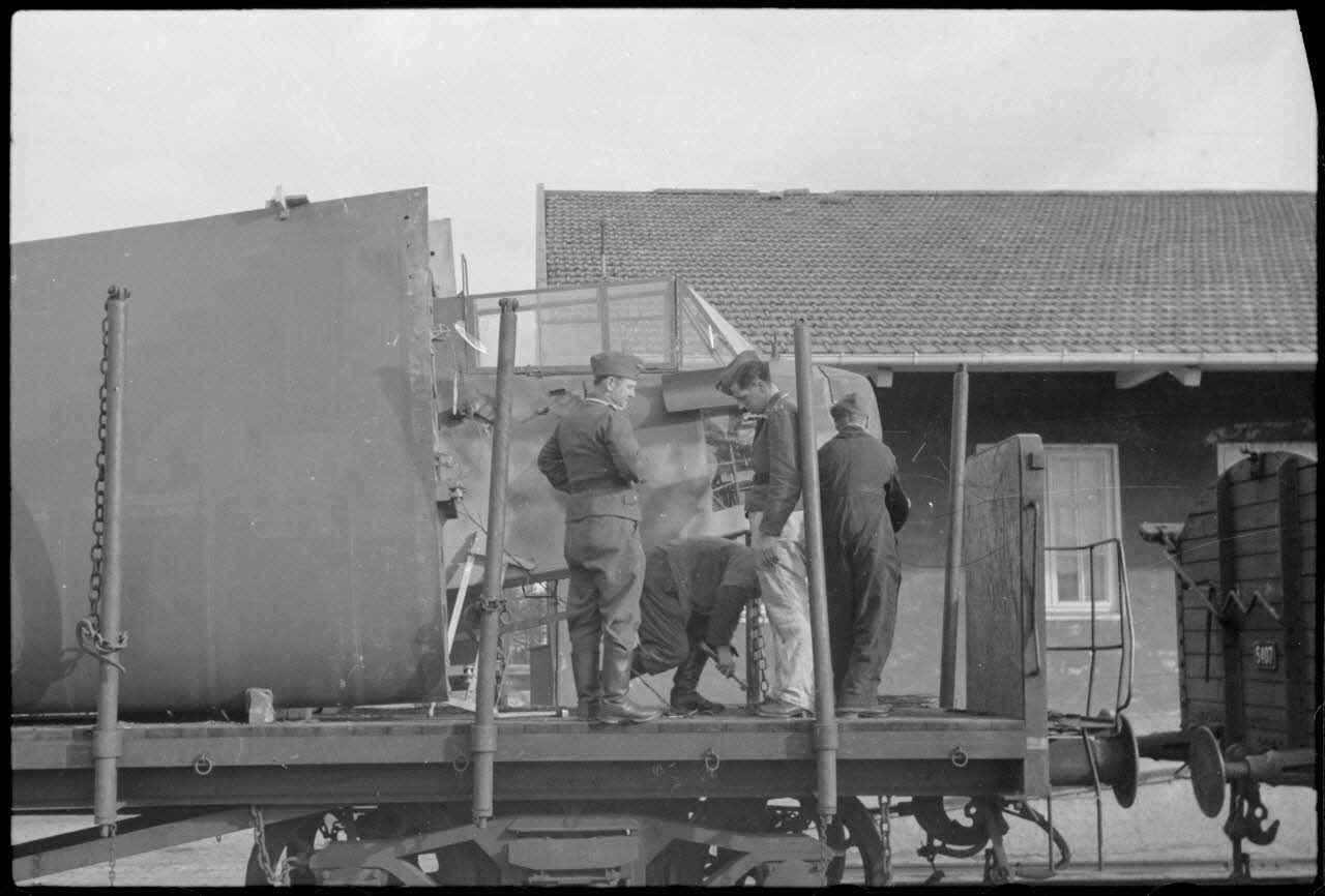 Sur le terrain d'aviation de Gardermoen, la mascotte du 8./LLG 1 (Lulftlandegeschwader 1) vient perturber le personnel du groupe lors de la fixation des planeurs DFS-230 sur des wagons de chemin de fer.