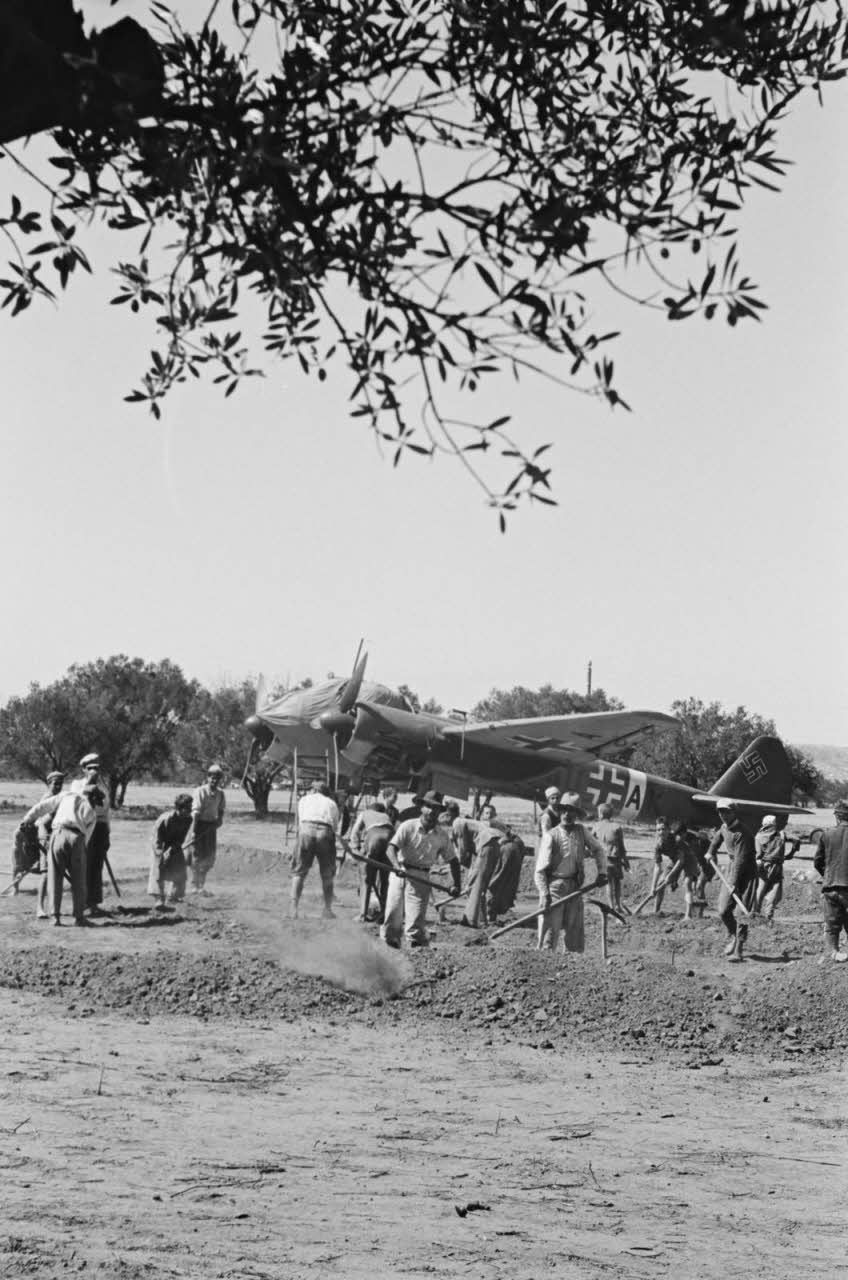 Derrière les ouvriers qui travaillent à l'agrandissement du terrain d'aviation de Kastelli (Crète), un chasseur lourd du Zerstörergeschwader ZG-26 identifiable grâce au code "3U" (à gauche) puis un avion de liaison Fieseler "Storch" codé P4 (sur la droite).