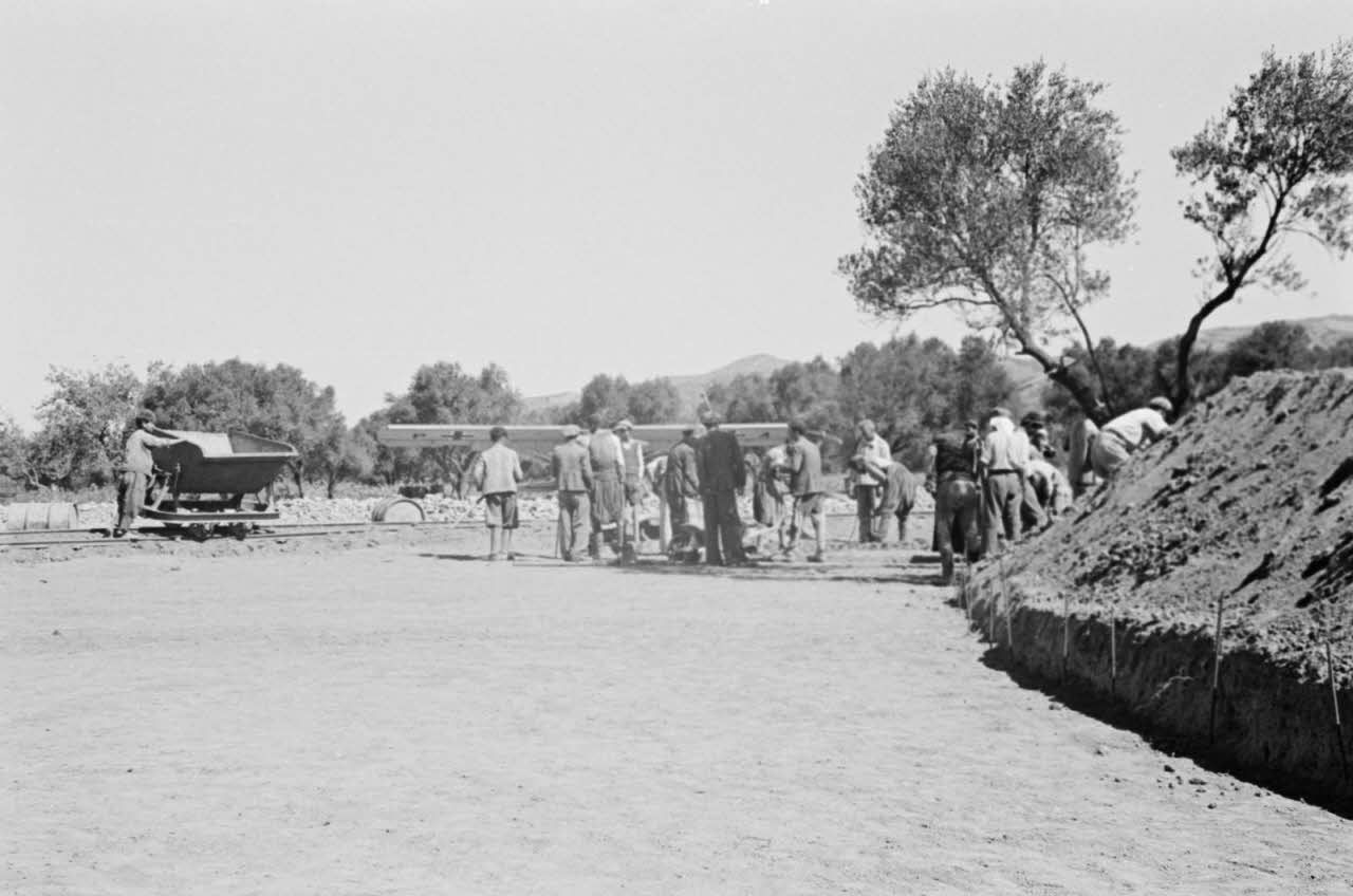 Sur le terrain d'aviation de Kastelli, en Crète, des ouvriers crétois travaillent à l'agrandissement de l'aérodrome.