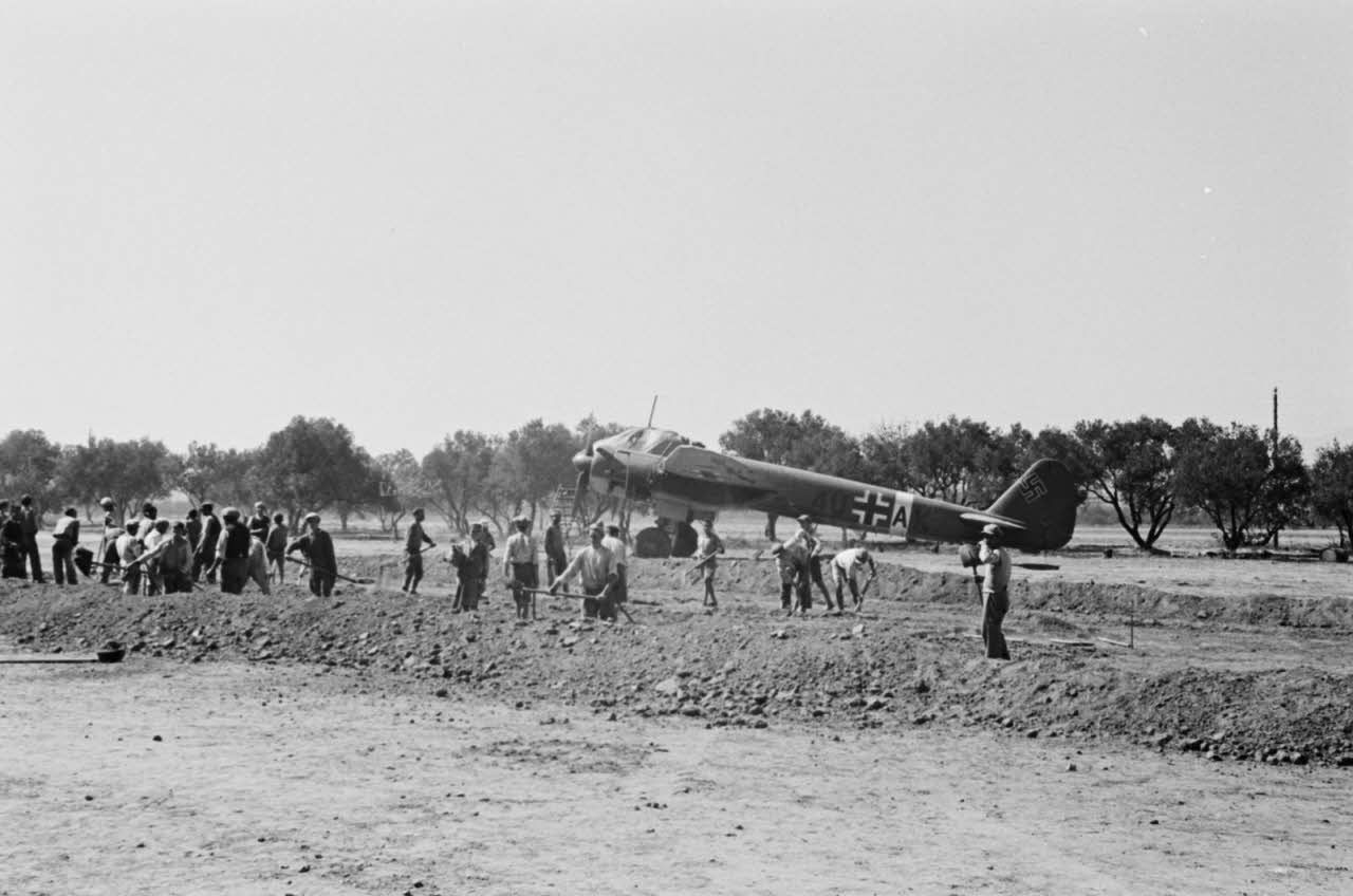 Derrière les ouvriers qui travaillent à l'agrandissement du terrain d'aviation de Kastelli (Crète), un chasseur lourd du Zerstörergeschwader ZG-26 identifiable grâce au code "3U" (à gauche) puis un avion de liaison Fieseler Storch codé P4 (sur la droite).