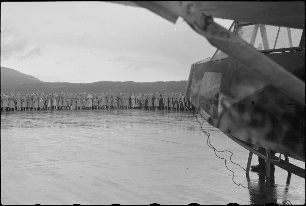 Sur le tarmac du terrain d'aviation de Trondheim-Vaernes (Norvège), une manœuvre débute en présence de nombreux officiers de la Wehrmacht (Heer, Luftwaffe et Kriegsmarine).