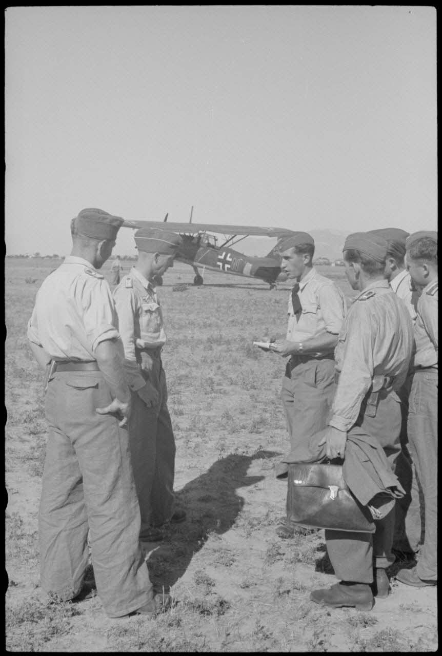 Sur le terrain d'aviation de Valence dans la Drôme, lors d'un exercice aéroporté, des officiers et des pilotes de Henschel Hs-126 du Luftlandegeschwader 1.