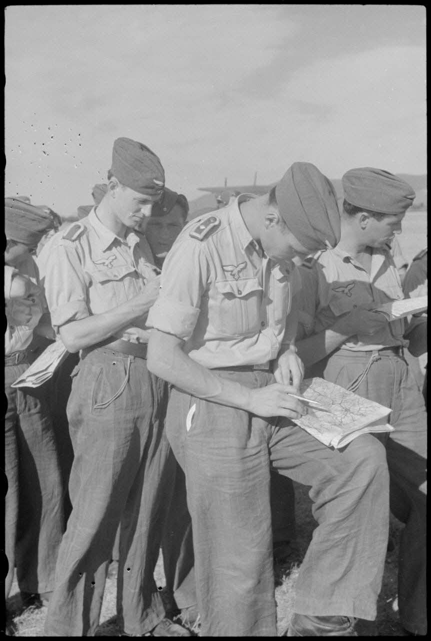 Sur le terrain d'aviation de Valence (Drôme), des sous-officiers du 1er groupe aéroporté allemand (Luftlandegeschwader 1) peu avant briefing.