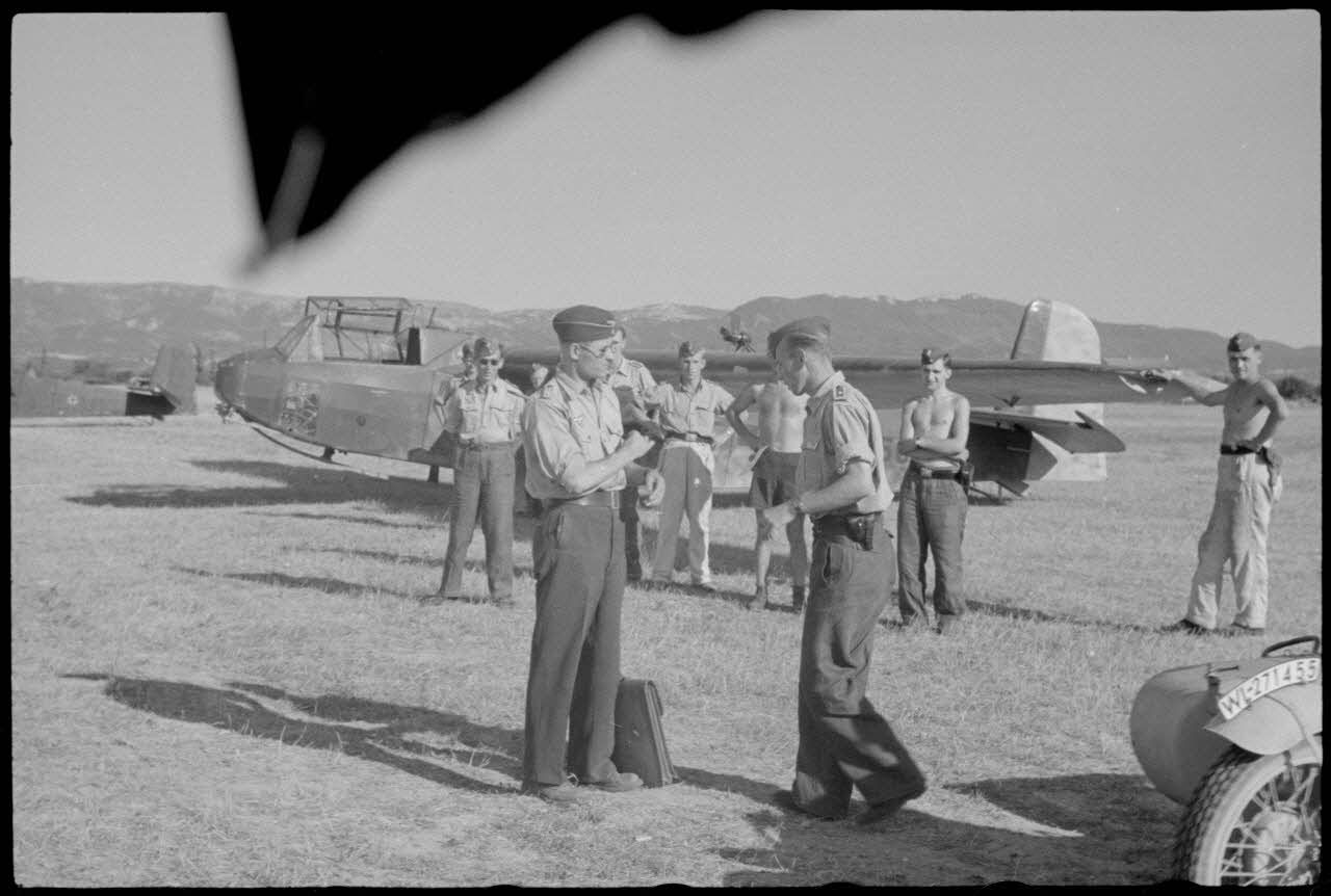 Sur le terrain d'aviation de Valence (Drôme), lors d'un briefing du 1er groupe aéroporté allemand (Luftlandegeschwader 1, III./LLG 1).