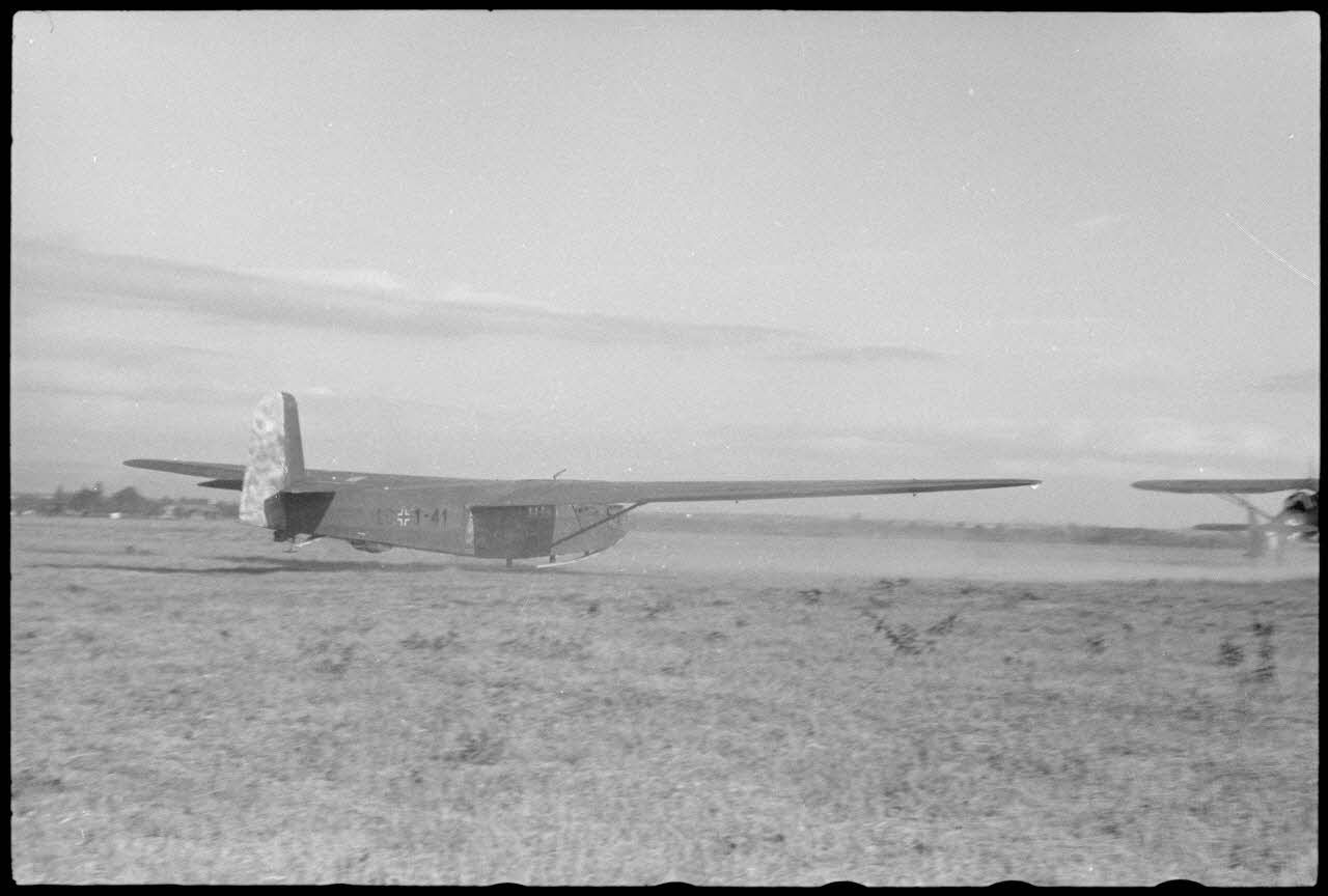 A bord d'un Henschel Hs-126, le photographe suit le largage d'un planeur puis l'atterrissage d'autres DFS-230.