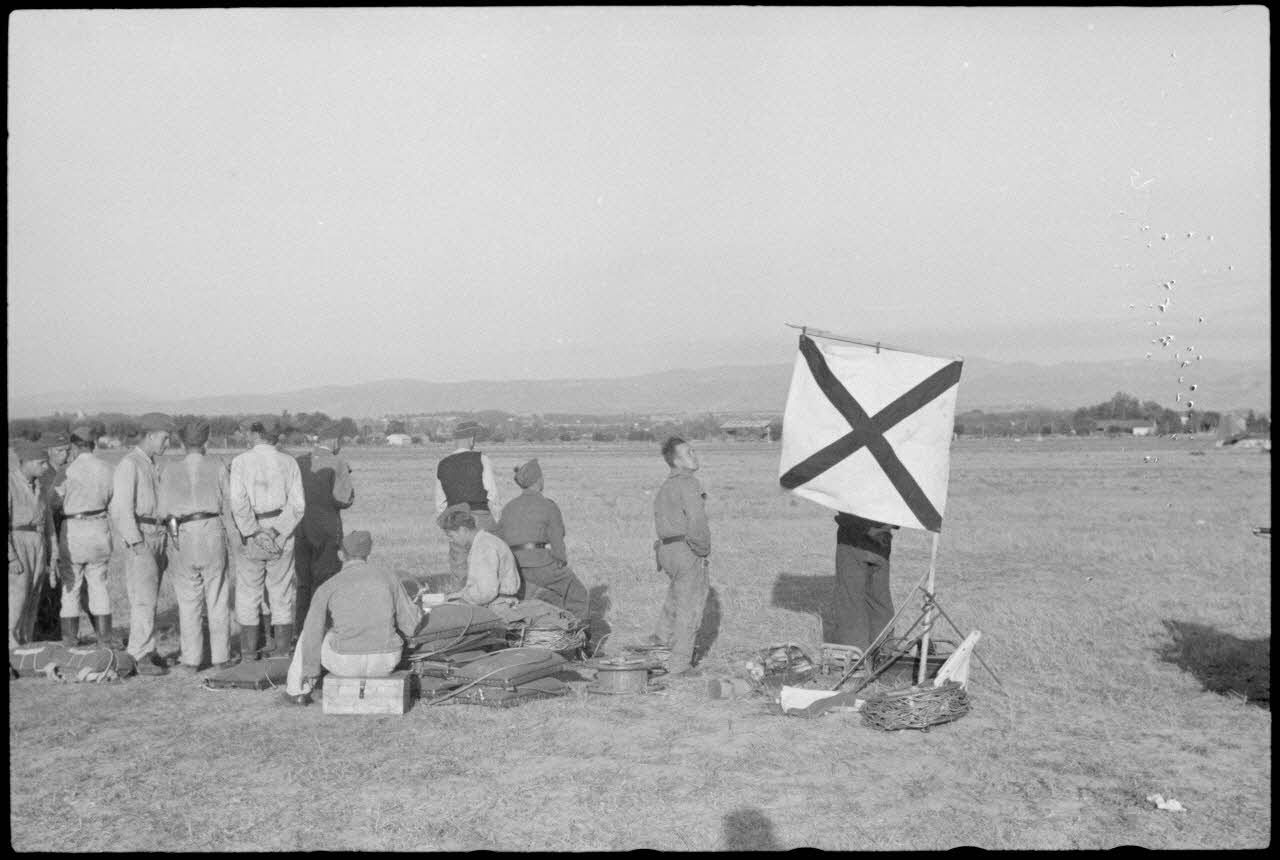 Le personnel au sol du Luftlandegeschwader 1 plie les parachutes alors que les planeurs DFS-230 atterrissent un à un sur l'aérodrome. A l'issue du vol, les pilotes et instructeurs discutent de la mission.