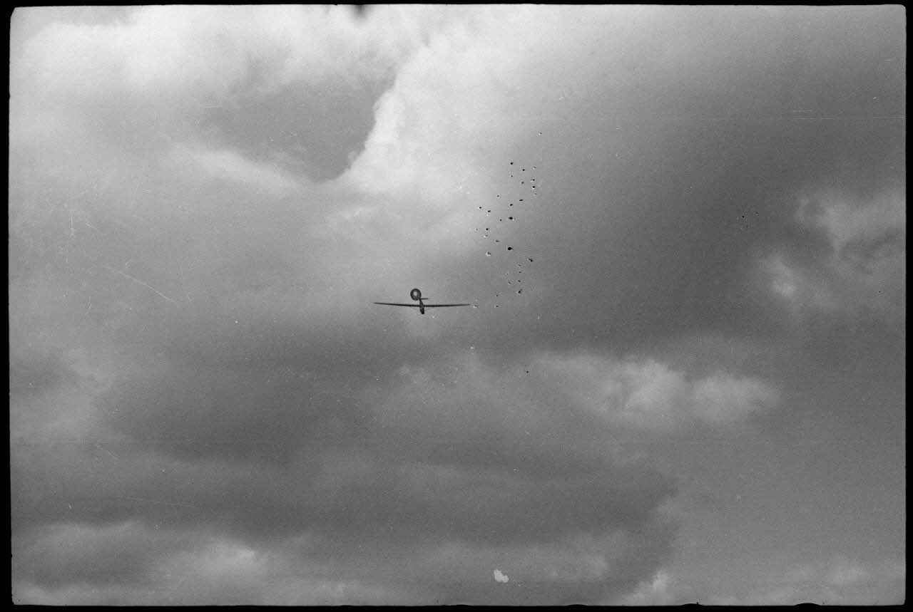Depuis le sol, le reporter observe le vol du planeur et de son remorqueur, la descente et l'atterrissage du DFS-230. Le planeur freiné par un parachute. Le cliché L28 présente un portrait du photographe Wolfgang Stocker. Au sol, le personnel de l'escadrille positionne les roues sous le planeur pour mieux le déplacer.