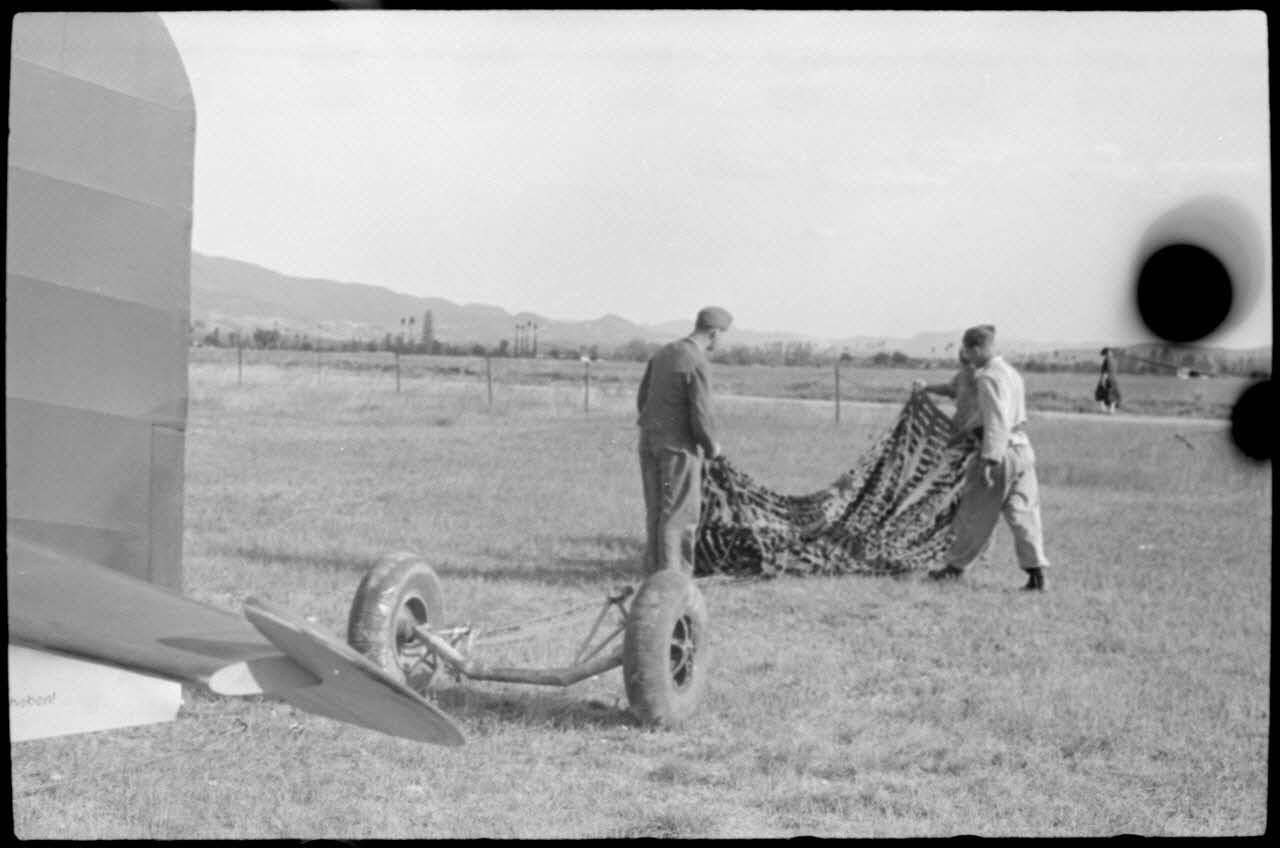 Sur le terrain d'aviation de Valence occupé par le Luftlandegeschwader 1, à l'issue d'un vol d'entraînement, pliage du parachute qui a freiné la descente du planeur DFS-230.