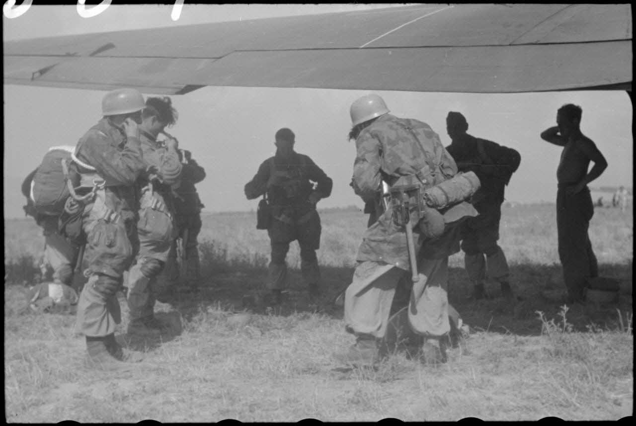 Sur le terrain d'aviation Naples-Pomigliano, des parachutistes de la 1.Fallschirm-Jäger-Division (1re division aéroportée allemande) s'équipent de leur parachute avant de monter à bord d'un Heinkel He-111.