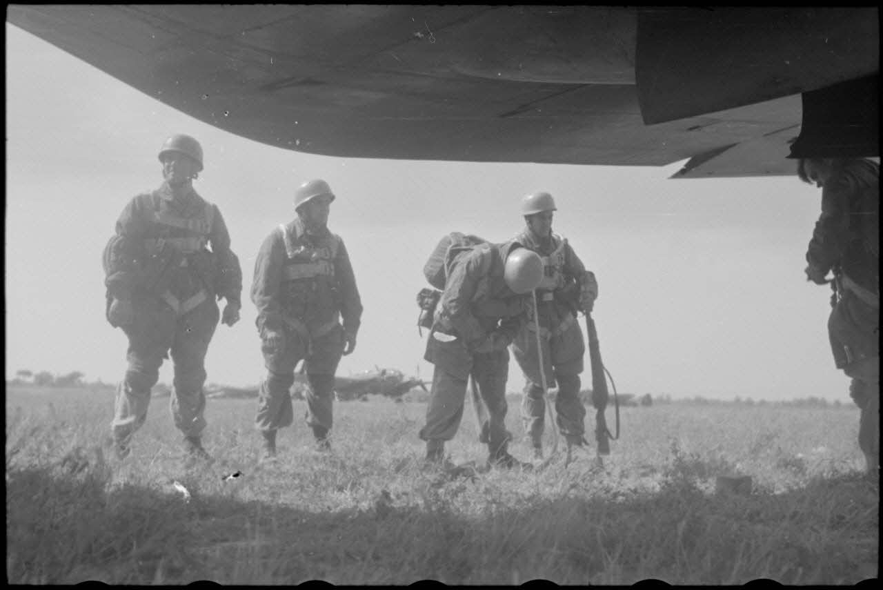 Une fois équipés, les parachutistes montent par le ventre de l'avion à bord d'un Heinkel He-111, puis le décollage a lieu.