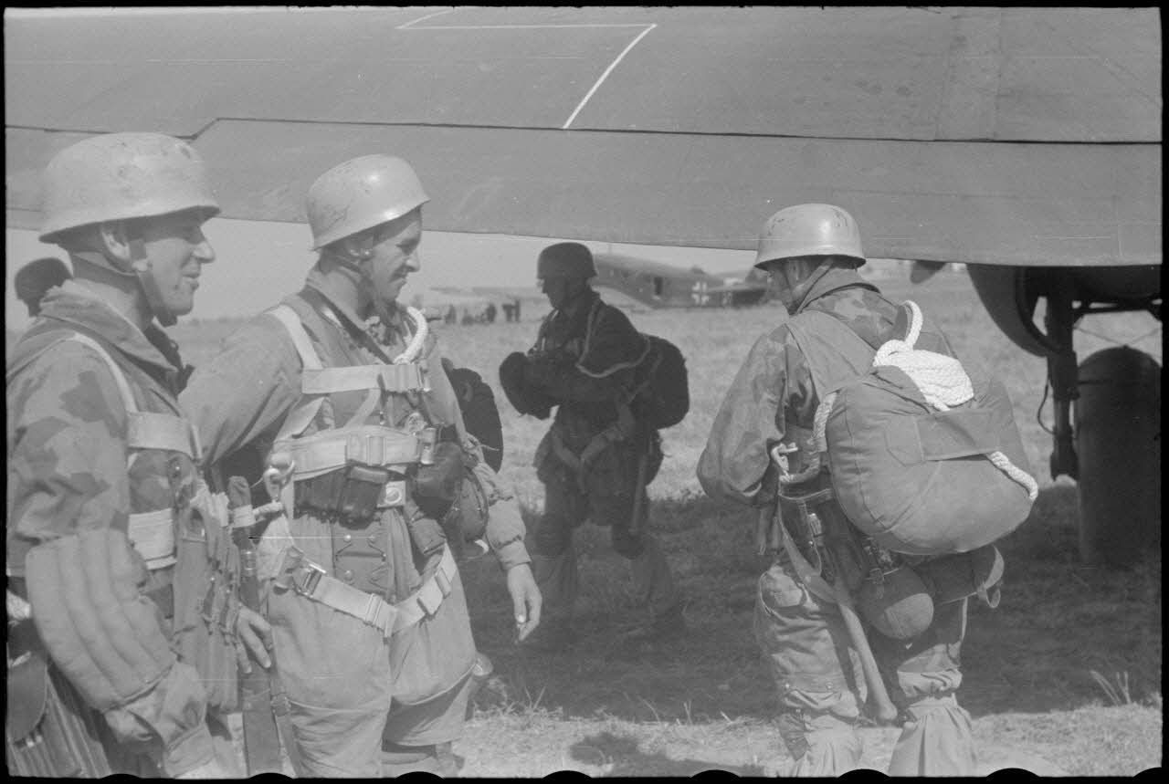 Des parachutistes de la 1.Fallschirm-Jäger-Division s'équipent de leur parachute avant de monter à bord des avions (Junkers Ju-52 et Heinkel He-111).