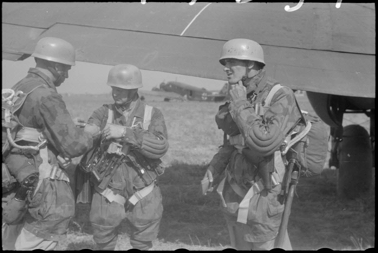 Des parachutistes de la 1.Fallschirm-Jäger-Division s'équipent de leur parachute avant de monter à bord des avions (Junkers Ju-52 et Heinkel He-111).