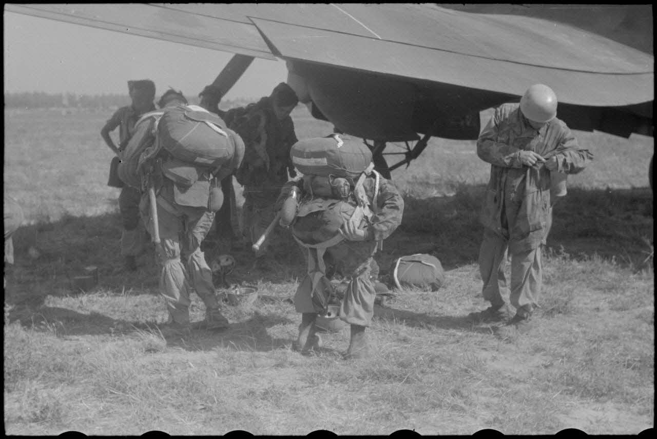 Des parachutistes de la 1.Fallschirm-Jäger-Division s'équipent de leur parachute avant de monter à bord des avions (Junkers Ju-52 et Heinkel He-111).